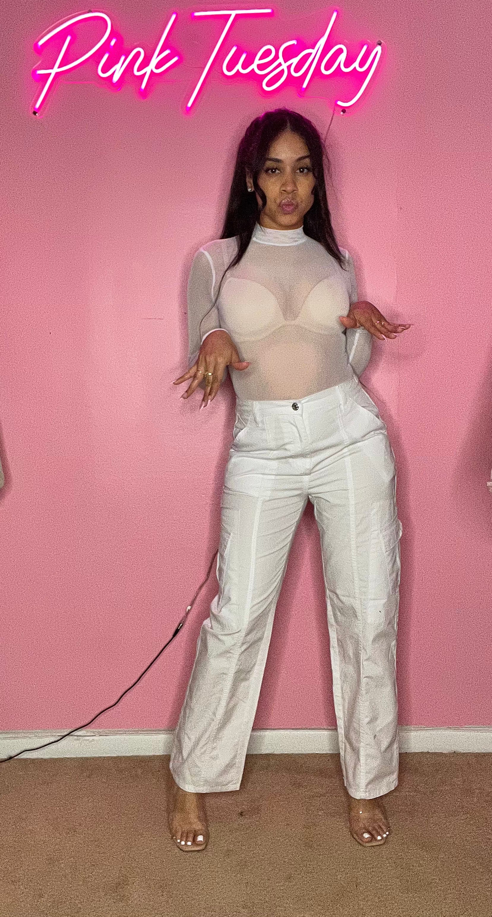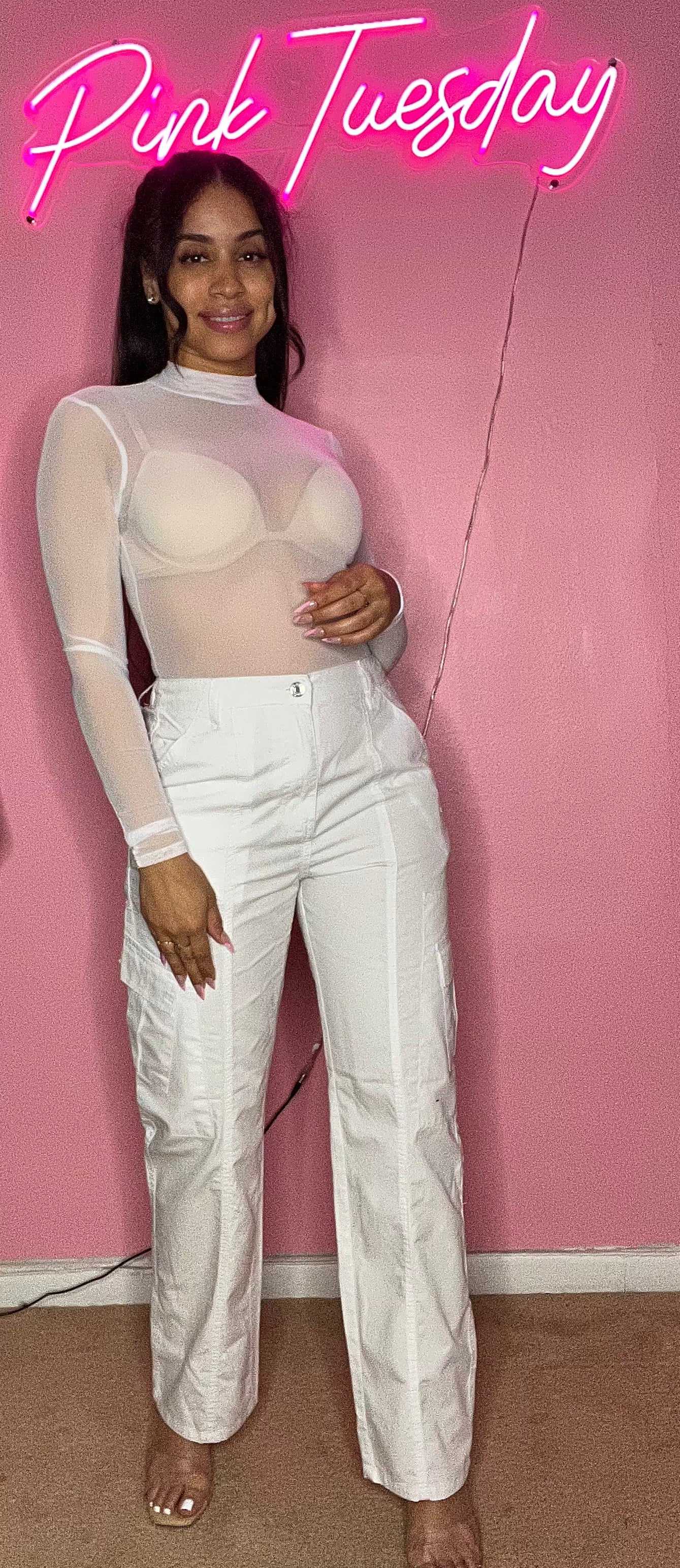 - Sheer white turtle neck bodysuit